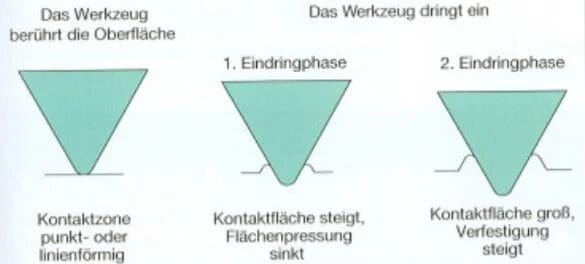 Zu Beginn der Umformung berührt das keilförmige Werkzeug die Oberfläche des zylindrischen Werkstücks. Die Kontaktzone ist punkt- oder linienförmig, je nach Geometrie des Rollwerkzeugs. Die Kontaktfläche des Werkstücks mit dem Werkzeug ist zu diesem Zeitpunkt, unter Berücksichtigung der elastischen Eigenschaften der Werkstoffe, klein. Die von der Maschine aufgebrachte Kraft führt damit zu einer Flächenpressung, die in der Regel weit über der Festigkeit des Werkstoffs liegt. In dieser ersten Rollphase, der Vorbereitungsphase, werden derart hohe Druckspannungen in das Rohteil eingebracht, dass sich das Material plastisch zu verformen beginnt.